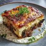 A layered casserole featuring tender eggplants, a savory meat sauce, and a rich béchamel topping, perfect for family dinners.