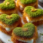 Serve: Serve your Gold-Dusted Pistachio Kunafa Hearts warm or at room temperature. This dessert can be enjoyed alone or paired with a scoop of vanilla ice cream for added indulgence.