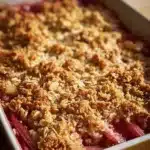 A delightful dessert that combines tart rhubarb with a sweet and crunchy topping, perfect for any gathering.